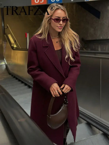 Women Burgundy Woolen Double Breasted Coat