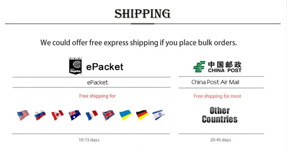 • Shipping Time: Standard delivery takes 7–15 business days, depending on your location.
