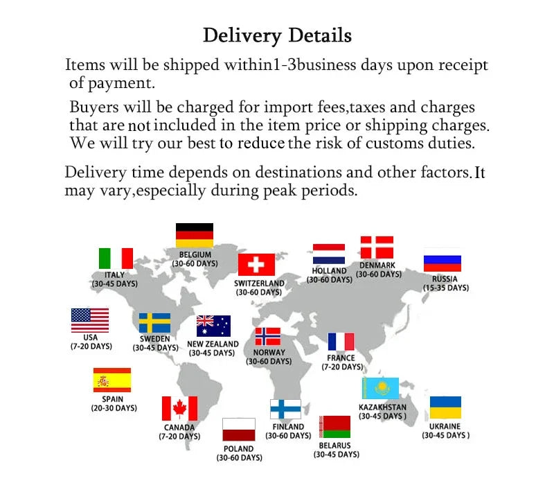 - Shipping Time: Standard delivery takes 7–15 business days, depending on your location.