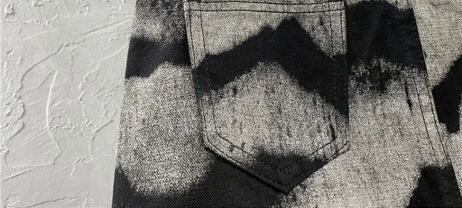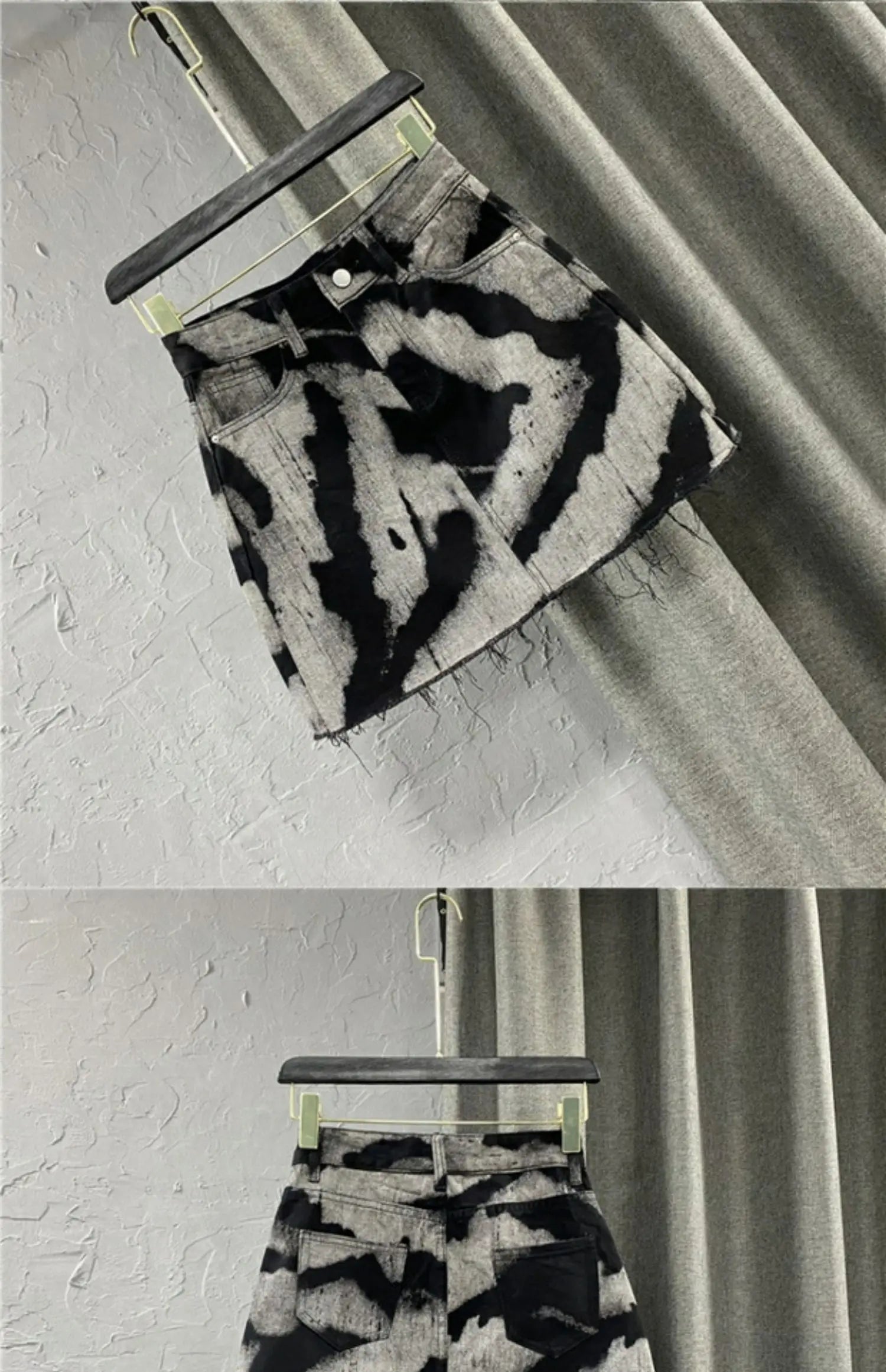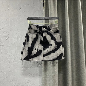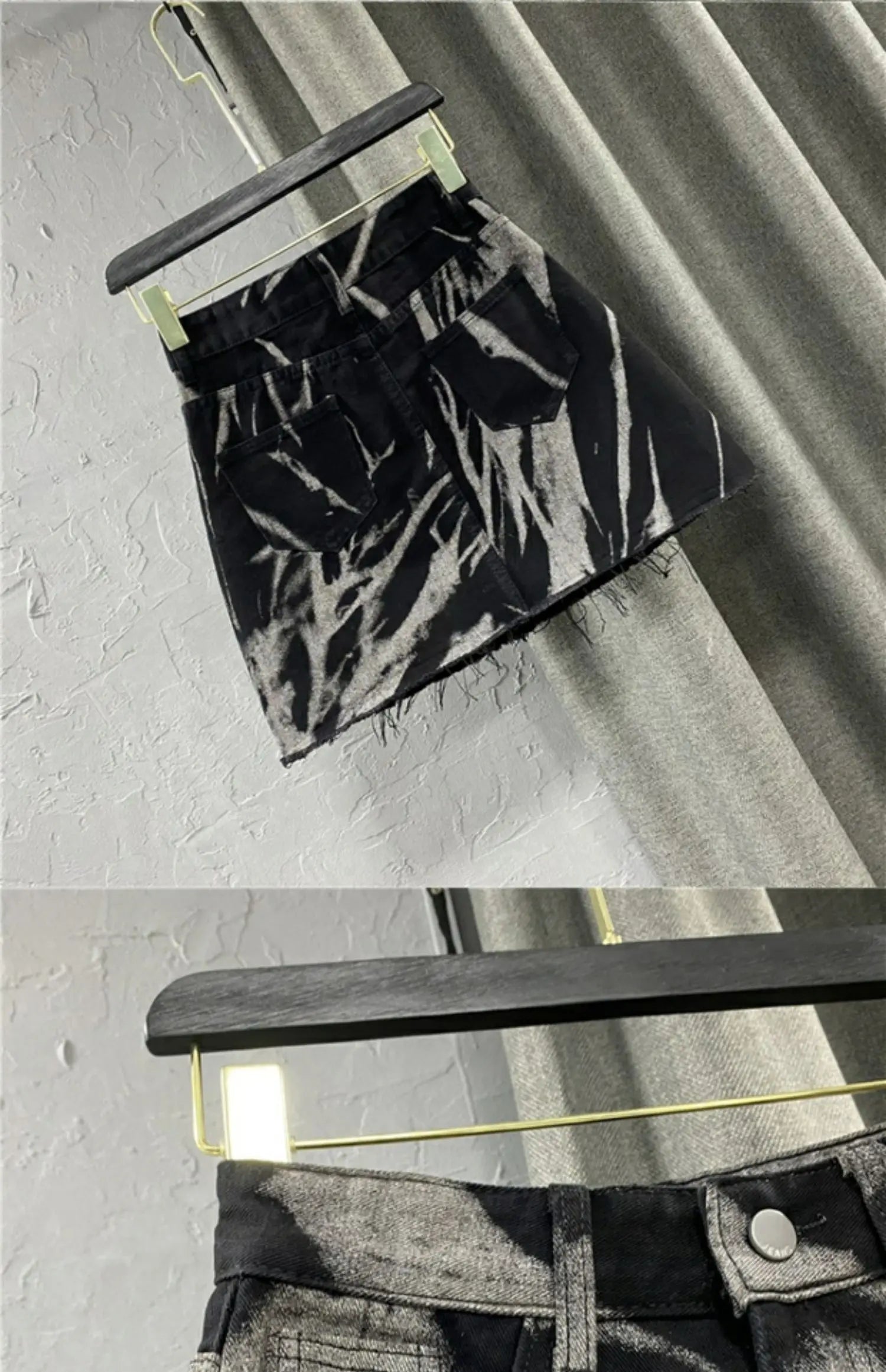 DyeDrape™ – Tie-Dye Short Denim Skirt (Black Gray, Fringed A-Line)