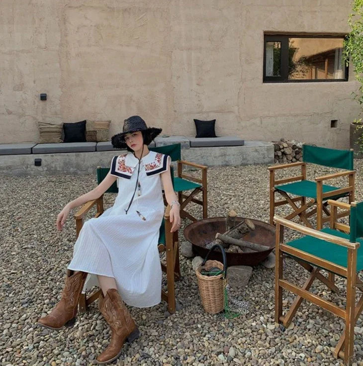 Women Mid Calf Boots Rose Embroidery Leather