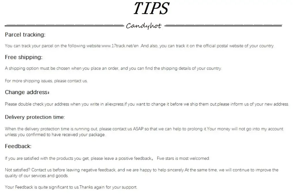 • Tracking: A tracking number will be provided once your order is shipped.