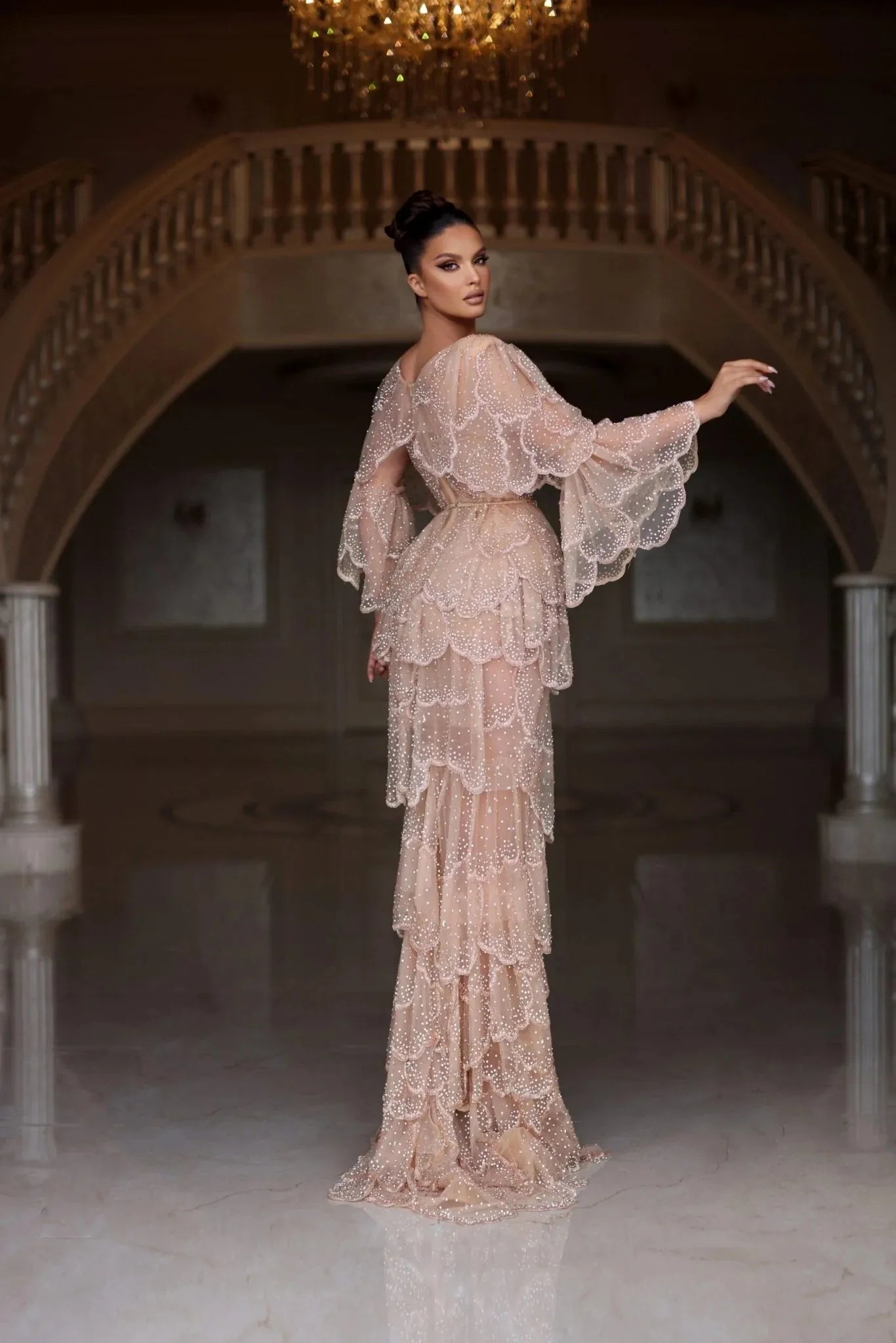 Arabic Nude Stone Wedding Gown – Tiered Sleeves Beige